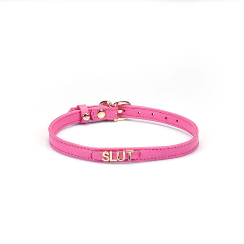 Liebe SeeleOntdek de ultieme uiting van persoonlijke stijl met de Liebe Seele Smalle Choker met Gouden Letters - "SLUT" - Italiaans Leer - Roze. Maak een stat...
