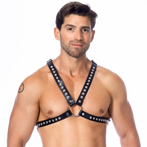 Rimba Bondage Play - Brustgeschirr mit Lederriemen - Dekorative Heftklammern - Schwarz
