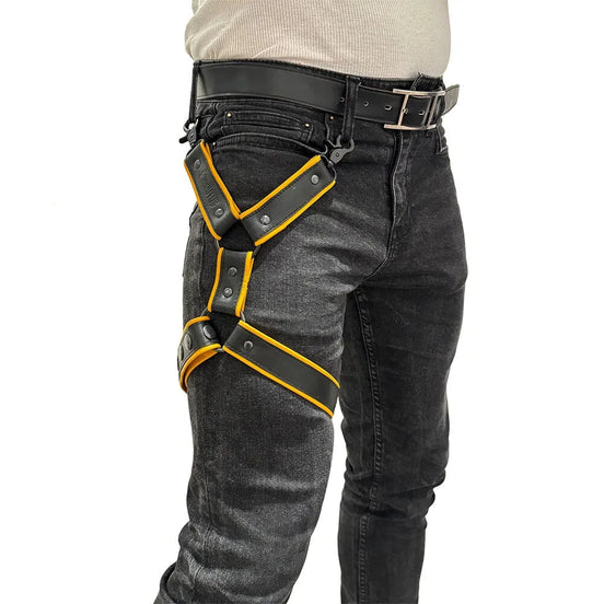 Fai risaltare il tuo look con l’imbracatura cosciale in pelle BRUTUS, un harness robusto e regolabile che esalta immediatamente la tua presenza. Pelle resistente, fibbie in acciaio inox e calzata su misura: perfetta per serate in club, incontri fetish e shooting audaci.