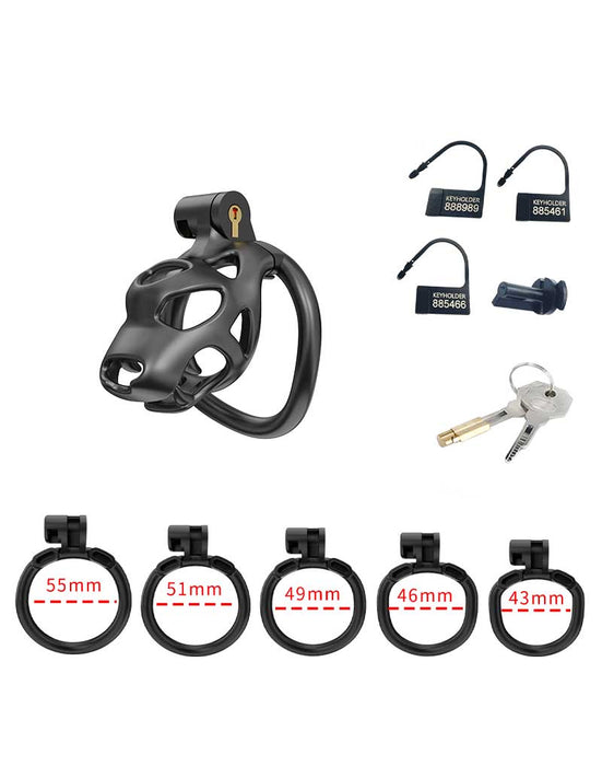 De Rimba P-Cage collectie bestaat uit verschillende soorten peniskooien. Deze kuisheidskooien zijn gemaakt van ABS-materiaal van hoge kwaliteit en bieden een comfortabele pasvorm met een lange levensduur. Een kuisheidskooi weerhoudt de drager van een erectie. Door de opening aan de voorkant van elke P-Cage kan de drager plassen zonder de kooi te verwijderen. Deze peniskooi set bevat 5 ringen in verschillende maten (variërend tussen 43 - 55 mm). Daarnaast bevat het 1 koperen inbouwslot en 3 plastic genummerde hangsloten. De plastic slotjes kunnen na eenmalig gebruik worden afgeknipt met een schaar. Tot slot worden er twee plastic schroeven meegeleverd als alternatief voor de koperen inbouwsloten, die je kunt gebruiken als je bijvoorbeeld door de veiligheidspoortjes van een vliegveld moet.