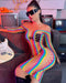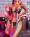 Schitter in deze kleurrijke visnet jurk met blote schouders en een speelse regenbooglook! Gemaakt van 95% polyamide en 5% spandex, biedt het stretchy materiaal een perfecte pasvorm die je lichaam subtiel omhult. Het off-shoulder design voegt een verleidelijke touch toe, terwijl de levendige kleuren en het opengewerkte patroon zorgen voor een gedurfde, energieke uitstraling. Ideaal voor festivals, spannende avonden of wanneer je gewoon wilt opvallen met een unieke en speelse stijl!